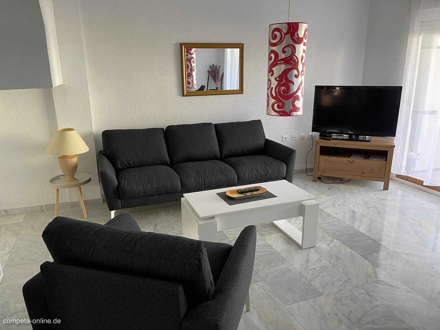Das Wohnzimmer und der Essbereich befinden sich im selbem Raum und grenzen an die geräumige Terrasse 2 mit Blick auf das Mittelmeer.